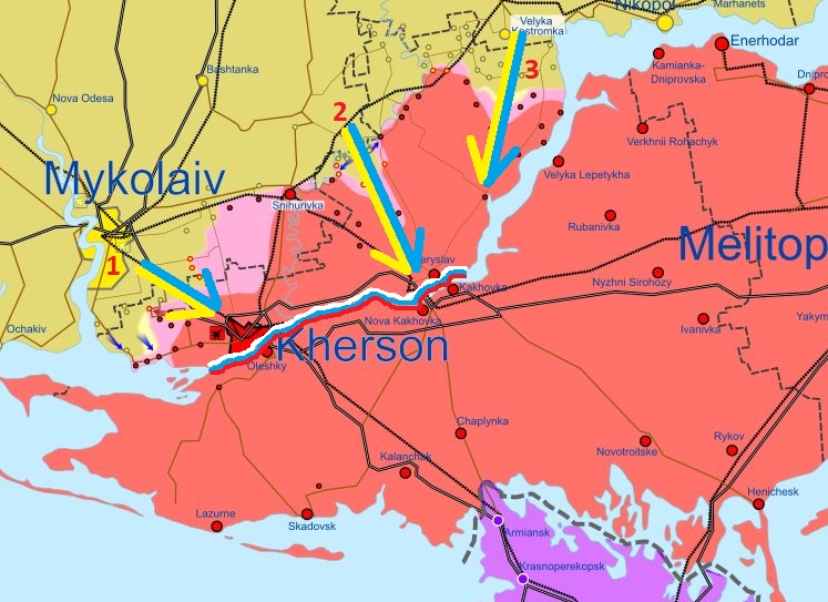 Niemniej istotny jest teatr działań wokół miasta Chersoń i prawobrzeżnych zdobyczy agresora. Tutaj widzimy powolne przesuwanie się ukraińskich wojsk na trzech głównych kierunkach natarcia. Jedno zmierza w stronę Chersonia, drugie Nowej Kachowki (ma na celu podzielenie rosyjskich wojsk w regionie na dwa i zasianie paniki) i trzecie, które napiera od północnego-wschodu. Od początku było wiadomo, że będzie to teren trudny do obrony dla Rosjan, jednak wraz ze wzrostem użycia przez Ukraińców precyzyjnych systemów artyleryjskich i niszczeniu przepraw przez Dniepr, sytuacja stała się dla agresora krytyczna. Tak, ma tutaj gros najlepszych swoich jednostek i kilka linii obrony. Jednak jakiekolwiek ich przełamanie, trwałe przerwanie szlaku komunikacyjnego, grozi tutaj Rosjanom stratami znacznie boleśniejszymi, niż te które otrzymali w obwodzie charkowskim. Dlatego nie jest wykluczone, że ostatecznie może dojść do znacznego odwrotu rosyjskich wojskowych z tego rejonu, przeprawienie się ich na lewobrzeżną Ukrainę i utworzeniu bardzo, bardzo trudnej do przejścia linii obrony wzdłuż Dniepru. Jest to logiczne z punktu widzenia wojskowego, choć z punktu widzenia polityczno-symbolicznego – będzie to kolejny duży cios dla Moskwy. Być może jednak mniejszy, niż zagrożenie odcięcia całego zgrupowania rosyjskich wojsk przez Ukraińców.