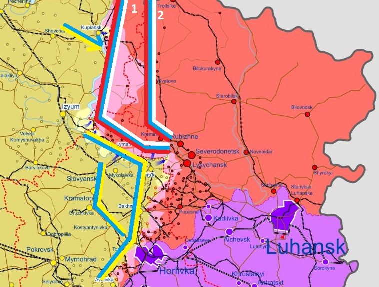 Przed Ukraińcami stoi w najbliższych tygodniach szereg możliwości ofensywnych. Po przełamaniu w obwodzie charkowskim aktualne pozostaje pytanie na ile szybko Rosjanie będą w stanie utworzyć linię obrony swoich zdobyczy w Donbasie. W obecnej chwili starają się ją zrobić wzdłuż rzeki Oskil (linia 1 na mapce), jednak najpewniej ich właściwą linią będą wzgórza kilkadziesiąt kilometrów na wschód (linia 2 na mapce), które pozwalają dobrze kontrolować teren. Tutaj Rosjanie muszą rzucić dużo wojsk i potraktować ten odcinek priorytetowo, gdyż ewentualne przełamanie obrony również tutaj może poskutkować totalną katastrofą i utratą wszelkich donbaskich zdobyczy uzyskanych po 24 lutego.