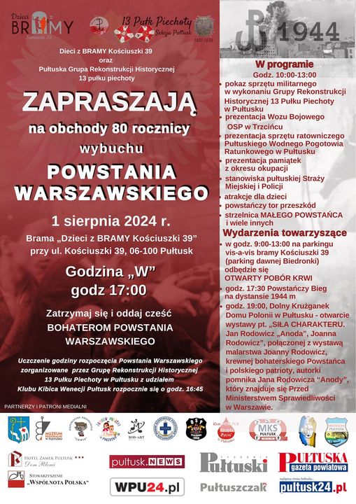 1 sierpnia, zawyją syreny i na dłuższą chwilę stanie ruch uliczny, zatrzymają się samochody, a przede wszystkim ludzie… Wcześniej, bo już 28 lipca pułtuszczanie spotkali się w bazylice na mszy świętej patriotycznej, jak w każdą ostatnią niedzielę miesiąca. A intencją mszy lipcowej było POWSTANIE WARSZAWSKIE; modlitwa za walczących, poległych i jeszcze żyjących powstańców i powstanki.
