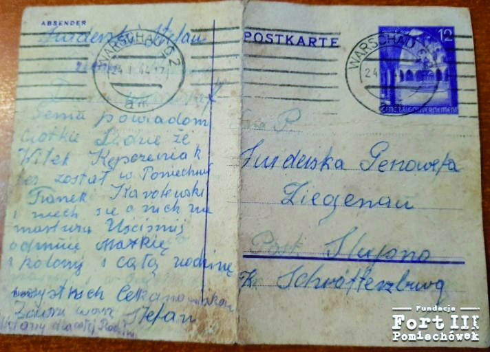 Fundacja otrzymała od Pana Grzegorza Chabowskiego zdjęcia niezwykle cennych pamiątek. Pierwsza to list, który więzień Fortu III w Pomiechówku – Pan Stefan Świderski (ps. Sęp) wysłał do swojej żony w styczniu 1944 r., w czasie transportu z Fortu III w Pomiechówku do KL Mauthausen. W liście Pan Stefan pisze, że jest na ulicy Daniłowiczowskiej 7 w Warszawie. W miejscu tym, w czasie II wojny światowej, znajdowało się więzienie sądowe, tzw. Centralniak. Stąd, po krótkim (często jednodniowym) pobycie, więźniowie Fortu III w Pomiechówku wysłani byli do obozów koncentracyjnych. W liście Pan Stefan pisze m.in: Geniu powiadom ciotkę Lodzię, że Witek Kępczeniak (Witalis Kępczyński) został w Pomiechówku i Franek Karolewski (Franciszek Karolewski) i niech się o nich nie zamartwia. Na koniec pozdrawia wszystkich Cekanowiaków. Pięć miesięcy później Pan Stefan Świderski zmarł w KL Mauthausen.