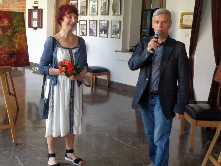 2019-08-23 1:11:10A w zamku METAMORFOZY, nowa wystawa malarska Polki z Hamburga Haliny Błażyńskiej. Malarkę, w dolnym krużganku, przedstawił pracownik Domu Polonii Wiesław Trzciński