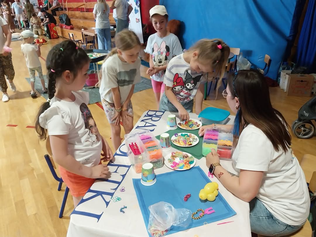 Na dzieci czekało mnóstwo atrakcji : kącik z kolorowymi bransoletkami, kącik tatuażu, kącik sensoryczny, kącik czytelniczy – gdzie można było również stworzyć zakładkę do książki, kącik z kolorowymi warkoczykami oraz puszczanie baniek mydlanych. Oczywiście były też dmuchańce, tor przeszkód oraz strażacy ratownicy z fantomem. Pokazywali, jak prawidłowo udzielić pierwszej pomocy poszkodowanemu. Na dworze można było zrobić sobie zdjęcie w wozie policyjnym oraz wozie strażackim. Nie mogłoby zabraknąć też stoisk gastronomicznych : popcornu, gofrów, kiełbasek z grilla, owoców i lemoniady.