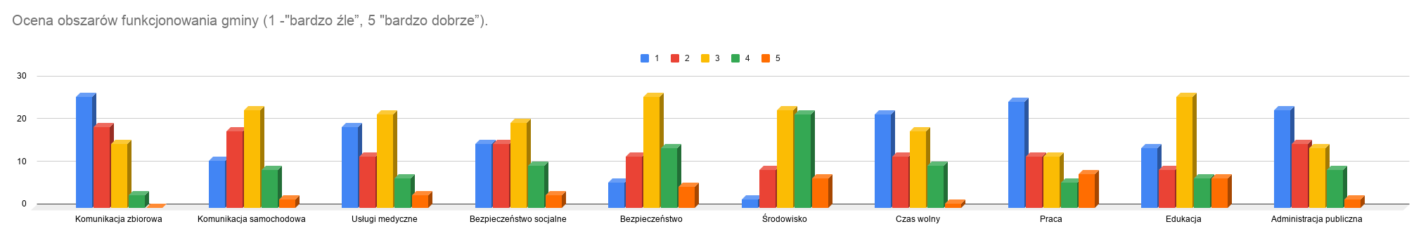 Mieszkańcy powiatu pułtuskiego zdecydowanie najsłabiej oceniają komunikację zbiorową oraz „czas wolny” i administracje publiczną. Za plus uważają natomiast edukację. Co ciekawe najwięcej jednocześnie ocen najniższych jak i najwyższych otrzymał obszar „praca”, co daje dużą rozbieżność w ocenie.