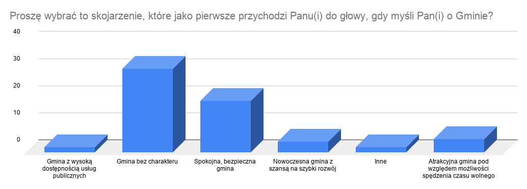 Ankietowani mieli również za zadanie wybrać skojarzenie, które jako pierwsze przychodzi im do głowy, kiedy myślą o swojej gminie. I tutaj zdecydowanie, solidarnie w każdym z powiatów wygrało określenie „gmina bez charakteru”. Najmniej z ankietowanych uznało, że jego gmina oferuje wysoki standard życia.