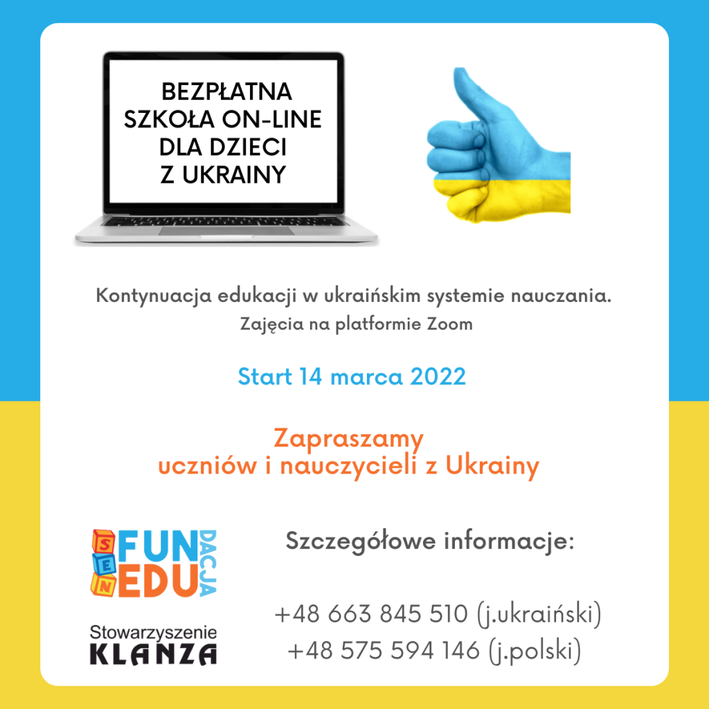 Fundacja Edu SEN oraz Stowarzyszenie Klanza uruchamiają bezpłatną szkołę Online dla dzieci z Ukrainy. Pierwsze zajęcia zdalne planowane są na poniedziałek (14 marca) na platformie ZOOM