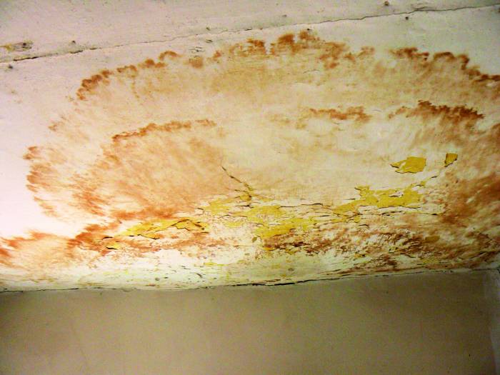 Nad schodami zwisa przemoczony przez uciążliwego lokatora sufit, co ewidentnie zagraża bezpieczeństwu mieszkańców