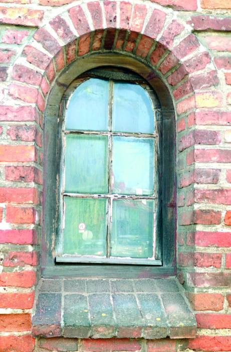 JEDNO Z PIĘKNYCH OKIENEK W PRZYSZPITALNEJ BASZCIE, będącej przed laty kostnicą – pułtuszczanie mówili: trupiarnią; w obiekcie znajdują się dwa otwory okienne, też zabytkowe, ciężkie drzwi obudowane ceglanym murem.