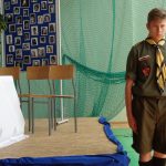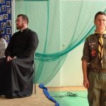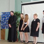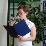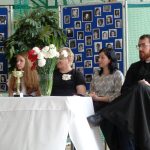 Oliwia (ze sceny): – Każdy Dzień Patrona ma swoją myśl przewodnią, wokół której koncentruje się cała uroczystość. I tak Bogdan Jański mówił już z tej sceny do młodych, a oni odpowiadali: “Jestem z Jańskiego – jestem dumny z tego!”. Był też Jański natchnieniem dla młodszych i starszych. A dziś? Dziś chcielibyśmy, aby przekonanie o jego duchowej obecności było szczególnie silne i aby dodawało nam otuchy. Bogdan Jański na pewno jest jednym z tych, którzy poprzez świadectwo swojego życia może udzielić odpowiedzi na wiele pytań. Elementem upamiętniającym postać PATRONA w naszej szkole jest tablica znajdująca się w holu gimnazjum, którą w dniu nadania imienia poświęcił ks. biskup Roman Marcinkowski. Stało się już tradycją, że podczas ważnych uroczystości składamy przy niej kwiaty. Dziś zrobią to przedstawiciele klas pierwszych, drugich i trzecich, którym kwiaty przekaże pan dyrektor.