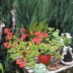 To jest ogródek … doniczkowy, na drewnianym, prostokątnym podeście. Mocno nasłoneczniony. Za podestem jest kawałek trawnika, na jego środku drzewo liściaste, pod ścianą domu rozciągają się trawy o zielonobrązowej barwie, a od płotu sąsiada rosną trawy o srebrnym i zielonym kolorycie