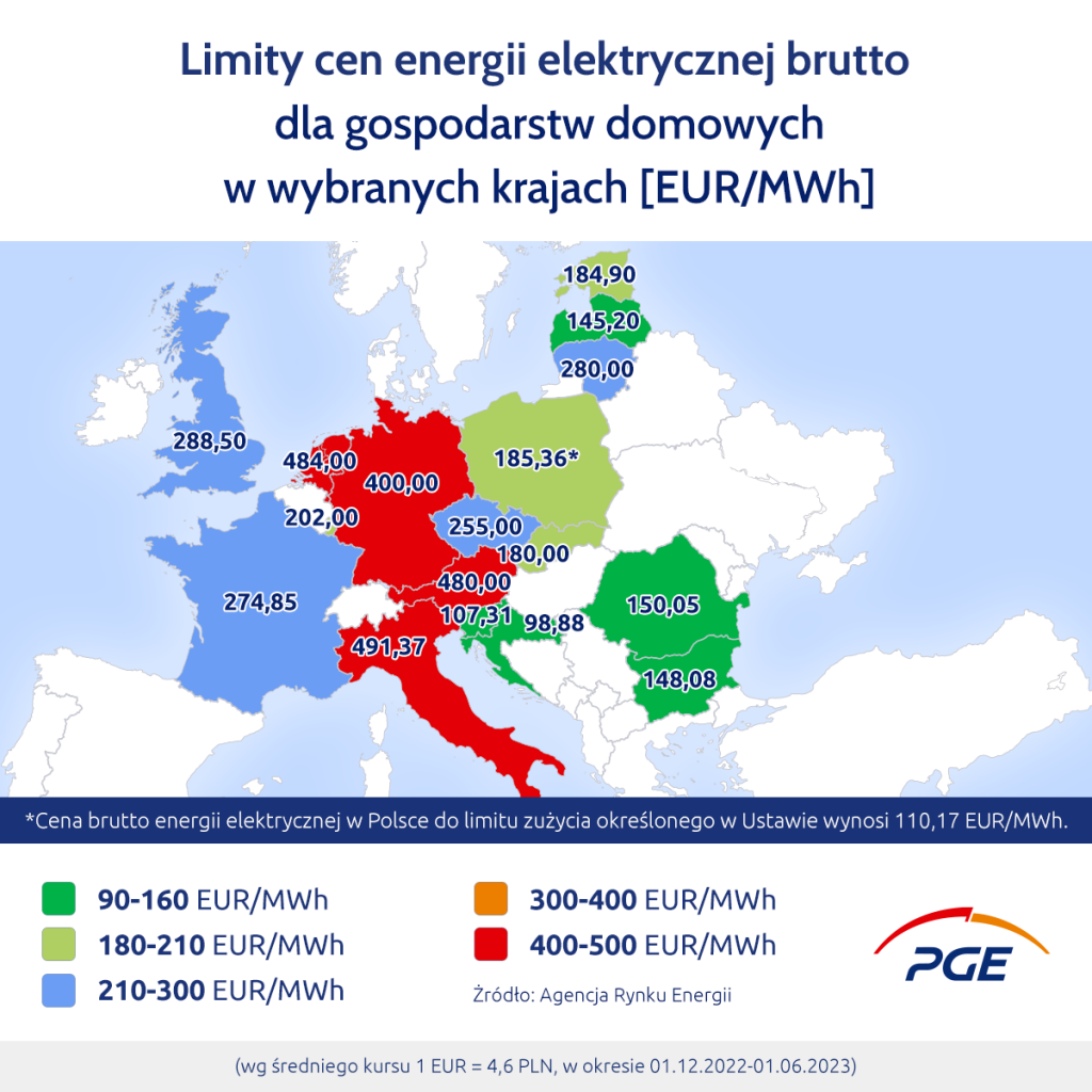 W Polsce, maksymalny limit cen energii elektrycznej dla gospodarstw domowych wynosi 185,36 EUR/MWh, czyli 852,66 PLN/MWh brutto i jest znacznie niższy od średniej europejskiej, która wynosi 256,21 EUR/MWh. Powyższy limit dotyczy tylko odbiorców, którzy przekroczyli maksymalny poziom zużycia, określony stosowną ustawą. Gospodarstwa domowe, które zużywają energię elektryczną poniżej określonych limitów (a jest ich w Polsce większość), mają zagwarantowane w 2023 roku ceny energii elektrycznej na poziomie taryf zatwierdzonych na 2022 rok, w wysokości 412 PLN netto (506,76 zł/MWh brutto), tj. 110,17 EUR/MWh brutto. Dodatkową ochronę dla odbiorców bytowych w Polsce, zapewniają też zamrożone na rok 2023 do poziomu w obowiązujących taryfach na 2022 rok, stawki opłat za świadczenie usług dystrybucji. Niższe opłaty za fizyczną dostawę energii, obowiązują podobnie jak w przypadku wyznaczonych limitów cenowych, do określonych poziomów zużycia energii przez odbiorcę.