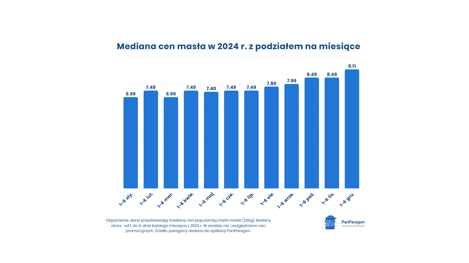 – Co ciekawe, pierwsze półrocze 2024 r. było dość stabilne cenowo. Od stycznia do lipca mediana cen regularnych oscylowała między 6,99 zł a 7,49 zł. Wahania te były na tyle niewielkie, że wielu konsumentów mogło nie zauważyć większych różnic w cenach – informuje Antonina Grzelak z aplikacji PanParagon. –Sytuacja uległa zmianie w drugiej połowie roku. W sierpniu cena regularna masła doszła do poziomu 7,80 zł, natomiast we wrześniu wynosiła już 7,99 zł. Jesienią wzrosty były jeszcze bardziej widoczne. W październiku i listopadzie cena za kostkę masła skoczyła do 8,49 zł, a w grudniu osiągnęła rekordowe 9,11 zł za sztukę – dodaje.