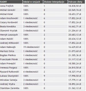 Tygodnik poprosił Biuro Rady o proste zestawienie: uczestnictwo w sesjach Rady, ilość interpelacji i wysokość pobranych diet. Tabelę przekazaną do redakcji pismem z 16 grudnia prezentujemy poniżej.
