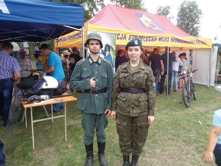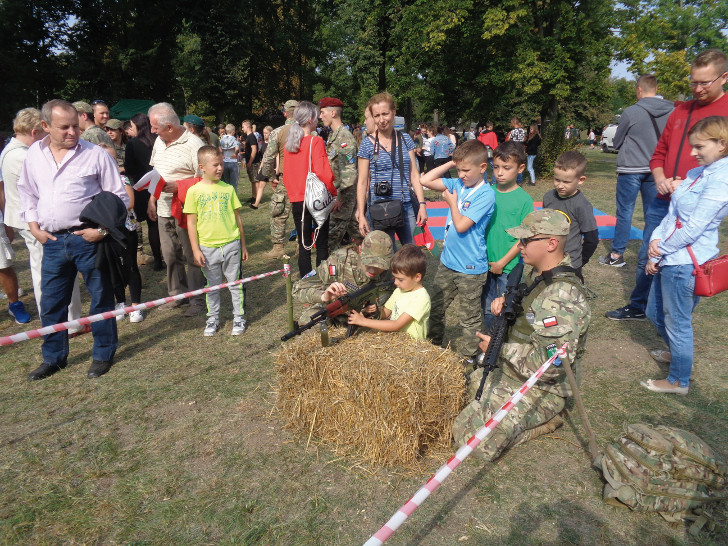 To był piękny występ Lili Kordowskiej, Laury Skrzypek i Nataszy Kozarzewskiej – wzruszający, pozostający w pamięci. Popłynęły słowa: “Do broni dziewczyno kochana, do broni chłopaku mój!”. Spikerka: – A przed nami owczarki niemieckie, belgijski i jeden holenderski. Zwróćcie uwagę, jakie to są mocne, silne psy. – Co chwilę ktoś do nas zagląda. Więcej dzieci, dorośli się krępują – mówią: Gabrysia, Sylwia, Mariusz i Paweł, którzy uczyli pierwszej pomocy. – O 17 będzie rekonstrukcja, stąd mam na głowie hełm niemiecki – mówi członek grupy rekonstrukcyjnej 13 pp Konrad Marciniak, stojący w towarzystwie Wiktorii Smolak. Kazimierz Karpiński: – Pomogłem w organizacji pikniku, dałem namiary na grupy i oddziały, które mogłyby się u nas zaprezentować. Wrzesień to czas różnych militarnych spotkań i rekonstrukcji historycznych, więc ludzie zajęci… A u nas świetnie jest, pogoda dopisuje. Waldemar Jaworski, motocyklista: – Poprosiłem kolegów, żebyśmy się spotkali, uświetnili tę imprezkę. Polecieliśmy do Głodowa, bo tam pradziadek jednego z motocyklistów zginął na Wschodzie podczas wojny, posadziliśmy tam dąb – symboliczny, katyński i w setkę motocykli przyjechaliśmy tutaj. Adam Gadomski z NP poleca syrop z zielonej szyszki sosny, rewelacyjny. – Jest bez czarny, jeżyna, malina. Jest mus z czarnego bzu. – Jak czarna materia – mówi Oluś. Przy okazji pytam pana Adama, doskonałego znawcę przyrody, o grzyby amerykańskie. – Osobiście ich nie widziałem, ale wczoraj mówił mi pracownik służby leśnej, że znalazł w Ulaskach koło Makowa. – Proszę sobie wybrać nagrodę: są batoniki, są kredki, czepki, lizaki, książeczki, chorągiewki. Sprawny jesteś jak żołnierz – mówi Janusz Pawlak, pracownik MOSiR do biorącego udział w torze przeszkód. – Dzieci lubią takie zabawy z pokonywaniem przeszkód, a tor mamy uniwersalny, dostępny dla wszystkich dzieci.
