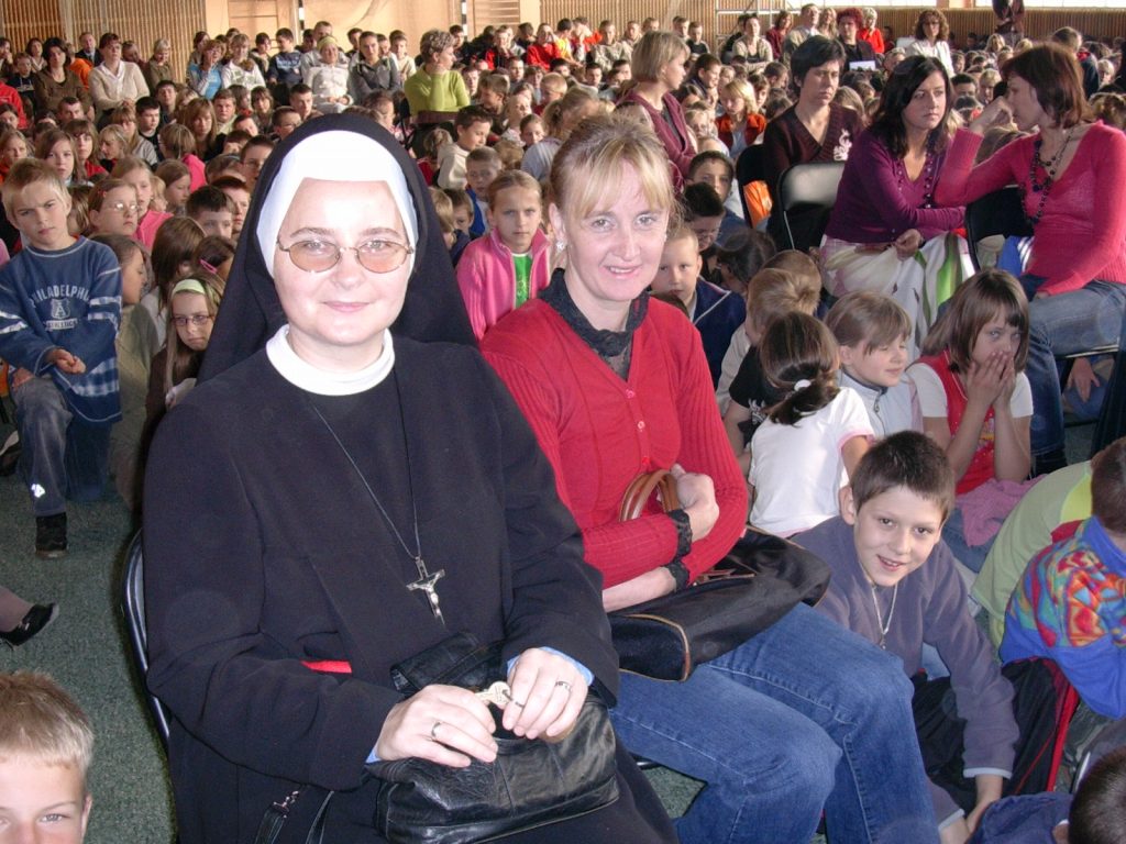 Lubię to zdjęcie. Wykonane zostało w CZWÓRKOWEJ hali sportowej. Wśród ciżby uczniów; na pierwszym planie panie, p. Danusia Jagiełło, moja miła uczennica, z JEDYNKI, dziś nauczycielka, mama dzieciom. Obok Danusi siostra zakonna. Nie znam jej imienia, ale widzę dobro na twarzy, jak u Danuty.