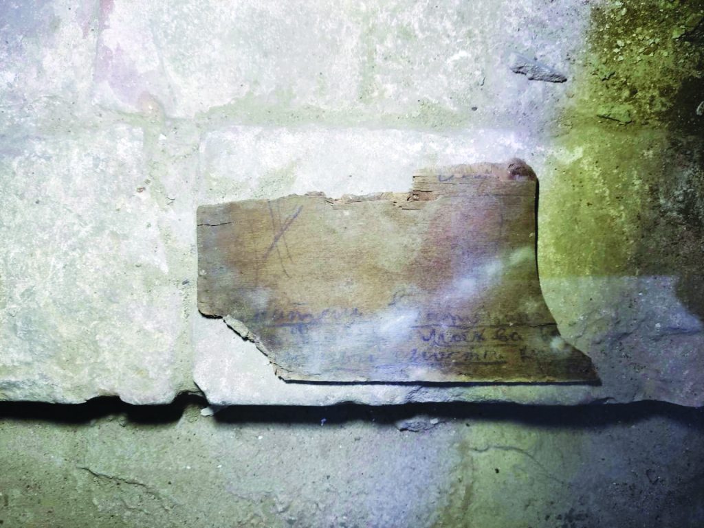 Fort III jeszcze długo będzie zaskakiwał. W ciągu kilku dni lutego niezwykłych odkryć na Forcie III dokonał pan Piotr Skonieczny. Poniżej widać kawałek sklejki, z wyraźnymi napisami w języku rosyjskim, w tym słowem „Moskwa” (vide strzałka).