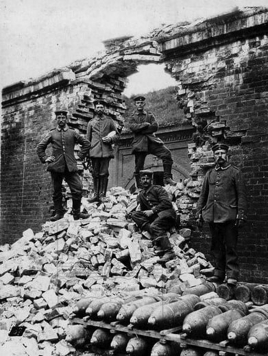 Została zrobiona zaraz po zdobyciu Fortu przez Niemców w sierpniu 1915 r. Zastanawiający jest jeden szczegół. Dziura w murze jest ogromna, więc duży kaliber miał działo, z którego wystrzelono pocisk (prawdopodobnie 15 cm schwere Feldhaubitze 18). Strzał padł z daleka (prawdopodobnie zza Wkry). Cegły zostały wyrzucone przez pocisk na zewnątrz muru, co potwierdza, że leciał od strony budynku koszar. Zastanawiające jest jak on spadł, że omijając stojący przed murem budynek wyrządził takie zniszczenia? Spadając dość stromo w dół za budynkiem nie powinien chyba takiej dziury zrobić?