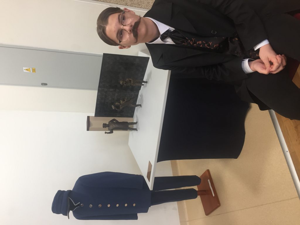 Na uwagę zasługiwał wystrój sceny – szczególnie katedra, znana wszystkim SKARŻANKOM i SKARŻAKOM, popiersie poety oraz oddalony od sceny zminiaturyzowany zbiorowy pomnik sprzed szkolnej bramy, przy którym siadywał uczeń-Gomulicki (Karol Kowalczyk). Gomulicki… Ten jakby wyjęty ze starych kart. Tylko Dendele, dendele zabrakło…