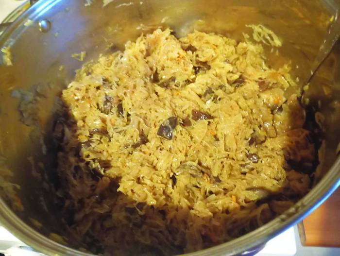 Z bigosem jest tak, że ile domów tyle bigosów. Ten którego miałaś okazję spróbować, był wariacją kilku przepisów, w tym Grzegorza Russaka, który to przepis nadal jest dostępny. Na początek zacząłem od bulionu z kaczej porcji rosołowej, goleni wołowej z kością, kawałka schabu i karkówki. Po wyjęciu mięsa i przecedzeniu trafiła do niego krojona kapusta kiszona i świeża. Drugą część schabu i karkówki podsmażyłem z cebulką na smalcu, podobnie postąpiłem z ugotowanym mięsem, kiełbasą jałowcową, chorizo, surowym boczkiem wędzonym i paskami krakowskiej. Ze słodszych akcentów pokrojone w kostkę śliwka świeża i suszona, morela suszona, gruszka, szara reneta, żurawina suszona, podsmażane na miodzie i powidłach. Oczywiście suszone grzybki, które wcześniej namaczamy, wodę wykorzystujemy do podlania bigosu, dodałem też czerwone wytrawne wino, trochę koniaku i nalewki z rabarbaru. Liść laurowy, ziele angielskie, jałowiec, goździki, przyprawa do grzanego wina, majeranek, zioła, siekany czosnek, musztarda. Podsmażony koncentrat pomidorowy i pomidory z puszki. No i to wszystko gotowane po trochu przez 3 dni.