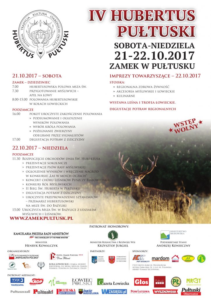 Obchody IV Hubertusa Pułtuskiego rozpoczną się w sobotę 21 października, mszą świętą o godzinie 7.00, na dziedzińcu zamkowym, po której myśliwi wyruszą na polowanie w kołach łowieckich. Główną atrakcją tego dnia jest pokot. W drugim dniu obchodów, 22 października, podczas ogólnie dostępnego widowiska edukacyjnego – artystycznego, uczestnicy będą mieli okazję obejrzeć pokazy ptaków drapieżnych oraz prezentacje psów rasy myśliwskiej. Skorzystać z atrakcji takich jak: stoiska kulinarne, stoiska z regionalną żywnością, wystawa leśna, a także konkursy dla publiczności i dla dzieci. Po zakończeniu obchodów w pierwszym i drugim dniu, dla wszystkich przygotowano degustację potraw z dziczyzny. Przedsięwzięcie ma charakter cykliczny, objęte jest Patronatem Honorowym Ministra Henryka Kowalczyka.