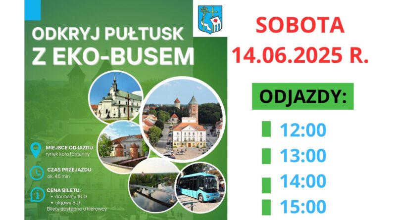 W sobotę, 14 czerwca 2025 r, w związku z organizacją Piknik – Polskie Zjednoczone Królestwo Motocyklowe w Pułtusku godziny odjazdów EKO-BUSA ulegną delikatnej zmianie.