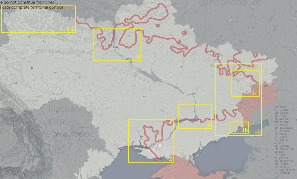 We wcześniejszych tekstach poświęconych sytuacji na froncie przywoływałem wiele nazw miejscowości i kierunków natarć Rosji. Dla ułatwienia zrozumienia istoty obecnych działań taktycznych i strategicznych, zamieszczam mapę na której zaznaczyłem cztery główne obszary aktywności rosyjskiej armii oraz jeden – potencjalny – armii białoruskiej. To są główne „teatry” tej wojny.