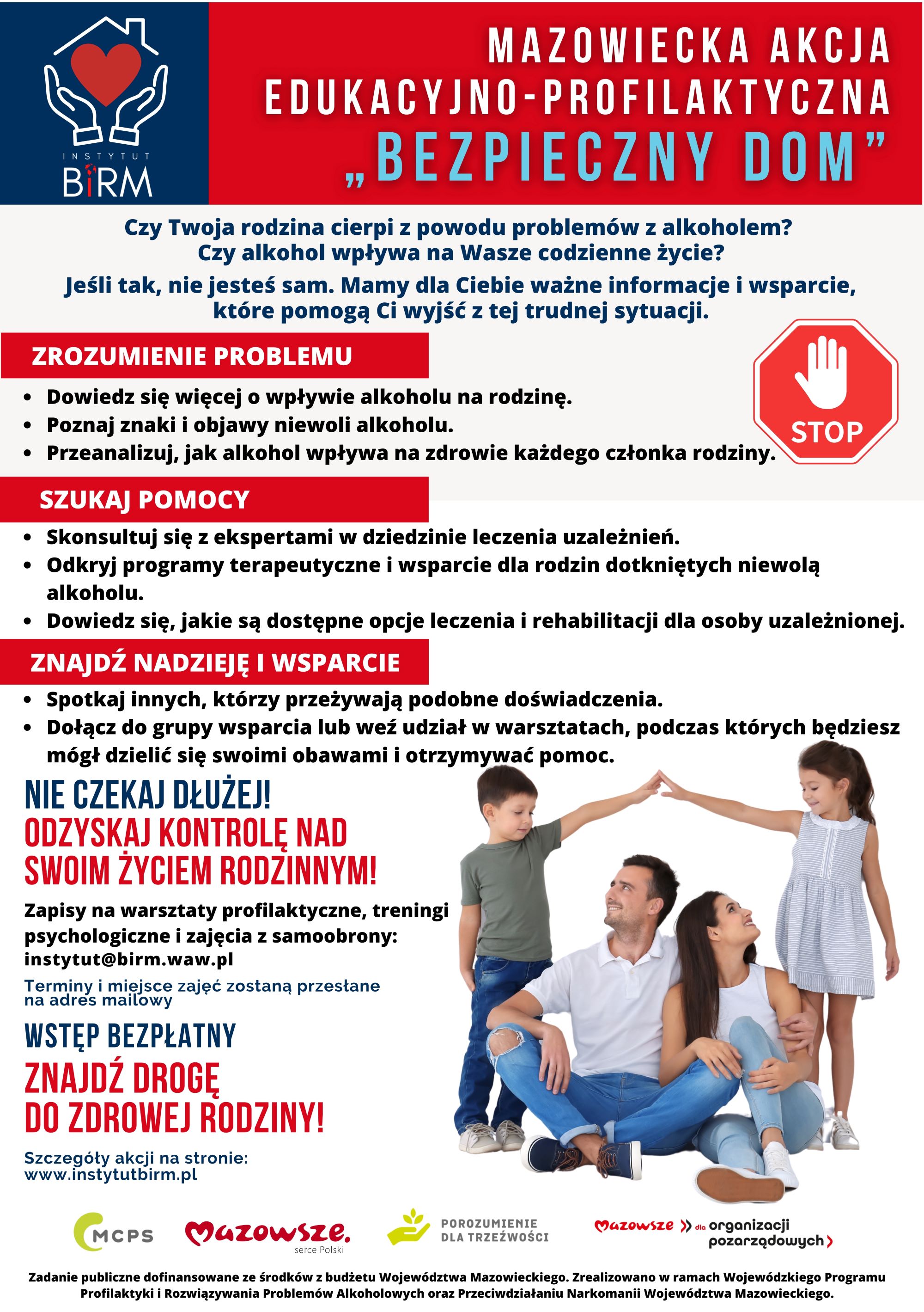 Celem głównym realizacji zadania jest ograniczenie przemocy w rodzinie oraz szkód związanych z problemami uzależnień w województwie mazowieckim, w tym w gminach wiejskich i miejsko-wiejskich. Zadanie publiczne dofinansowane zostało ze środków z budżetu Województwa Mazowieckiego i realizowane jest w ramach Wojewódzkiego Programu Profilaktyki i Rozwiązywania Problemów Alkoholowych oraz Przeciwdziałaniu Narkomanii Województwa Mazowieckiego. Szczegóły akcji dostępne są na stronie: https://instytutbirm.pl/mazowiecka-akcja-edukacyjno-profilaktyczna-bezpieczny-dom/