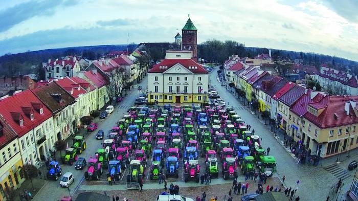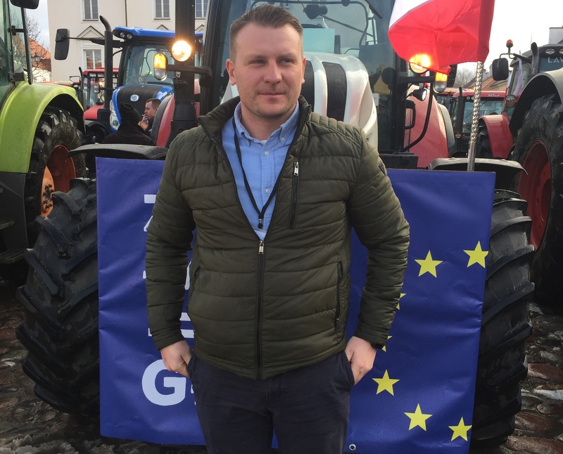 – Mateusz Żurawiński, NA TLE TRAKORA, organizator akcji: – Zjednoczyliśmy się z rolnikami z całej Europy i mamy strajk. Chcieliśmy zaprotestować przeciwko polityce Unii Europejskiej, która nas w dużej mierze doprowadza do bankructwa; przeciwko sprowadzaniu produktów z Ukrainy niższej jakości od naszych, przez co nasze rolnictwo robi się niekonkurencyjne w stosunku do rolnictwa ukraińskiego. No i ZIELONY ŁAD, ograniczenia w produkcji roślinnej, zwierzęcej, wprowadzenie różnych niekorzystnych dla nas norm. My mamy obostrzenia, Ukraina ich nie ma – również protestujemy przeciwko temu. Postulaty ŁADU to ograniczenie stosowania pestycydów, nawozów, środków przeciwdrobnoustrojowych, czyli Ukraina bez tych obostrzeń jest konkurencyjna. No i jeszcze ugorowanie… A skąd przyjechali rolnicy? Z całego powiatu, też z ościennych, mieli nas wesprzeć rolnicy z nowodworskiego, spod Wyszkowa. Około 130 traktorów. Przygotowanie było spontaniczne. A ja chciałbym podziękować wszystkim rolnikom – jest w nas siła i jeśli polityka unijna będzie szła w stronę, w którą idzie, to będziemy częściej strajkować, mówić, że nie godzimy się na jej poczynania.