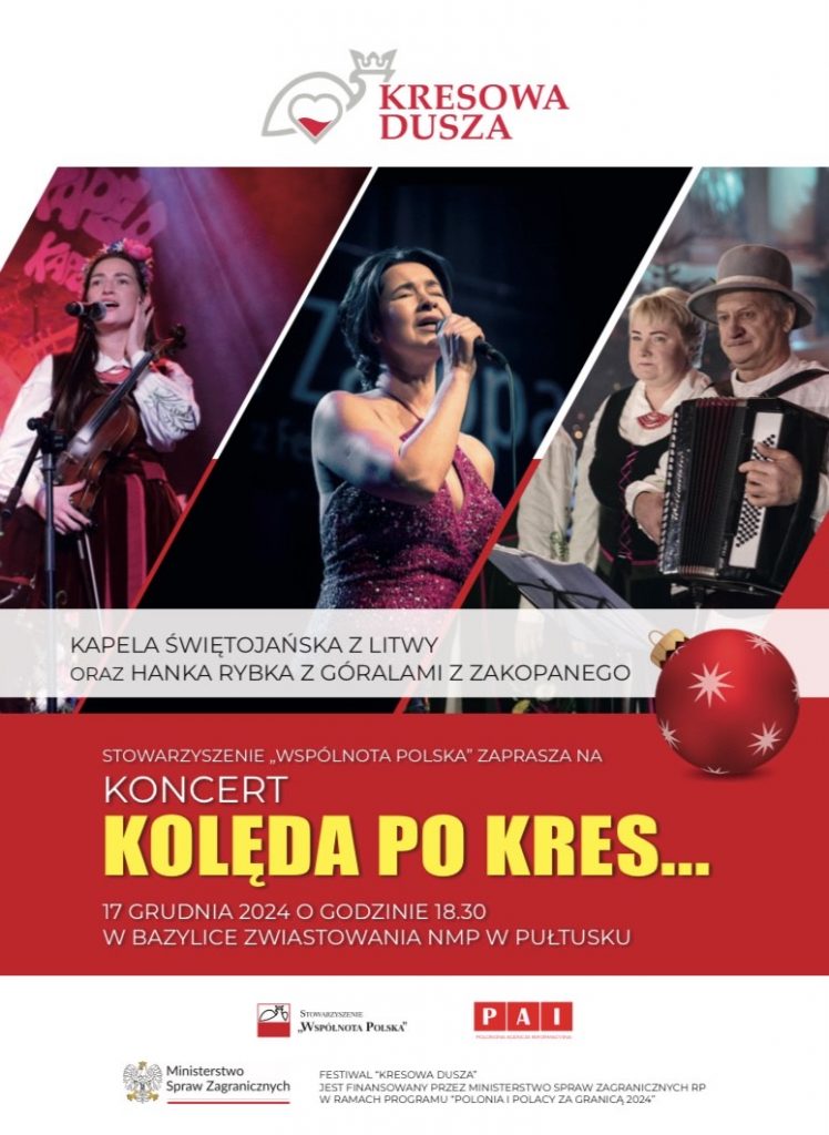Stowarzyszenie “Wspólnota Polska” serdecznie zaprasza na wyjątkowy koncert “KOLĘDA PO KRES…”, który odbędzie się w ramach festiwalu “Kresowa Dusza”.