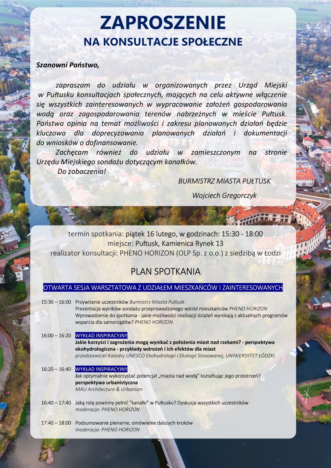 Burmistrz Miasta Pułtusk zaprasza do udziału w organizowanych przez Urząd Miejski w Pułtusku konsultacjach społecznych, mających na celu aktywne włączenie się wszystkich zainteresowanych w wypracowanie założeń gospodarowania wodą oraz zagospodarowanie terenów nabrzeżnych w mieście Pułtusk. Państwa opinia na temat możliwości i zakresu planowanych działań będzie kluczowa dla doprecyzowania planowanych działań i dokumentacji do wniosków o dofinansowanie.