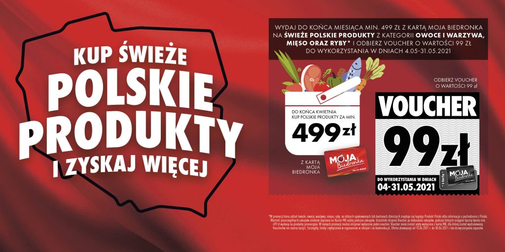 Każdy klient posiadający kartę Moja Biedronka, który od 15 do 30 kwietnia wyda łącznie 499 zł na świeże polskie produkty z kategorii: mięso, ryby, owoce lub warzywa, otrzyma od sieci Biedronka voucher o wartości 99 zł na zakupy w Biedronce do wykorzystania w maju 2021 r. Wartość zakupów będzie się sumowała na karcie Moja Biedronka i będzie też drukowana na paragonach zakupowych klientów. Voucher będzie można wykorzystać jednorazowo podczas zakupów z kartą Moja Biedronka w maju na właściwie cały asortyment dostępny w sklepie poza standardowymi wyłączeniami (alkohol, papierosy, produkty żywienia początkowego, doładowania kart i usług).