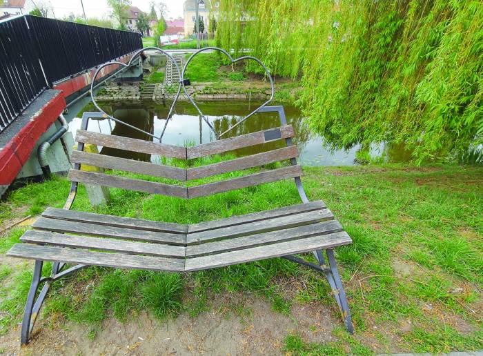 Oto ławka miłości przy MOSTKU MIŁOŚCI, pełnym kwiatów. Postawiona przez byłego burmistrza Krzysztofa Nuszkiewicza, o czym można przeczytać na blaszce, stoi opuszczona, widać na niej ząb czasu. A szkoda…