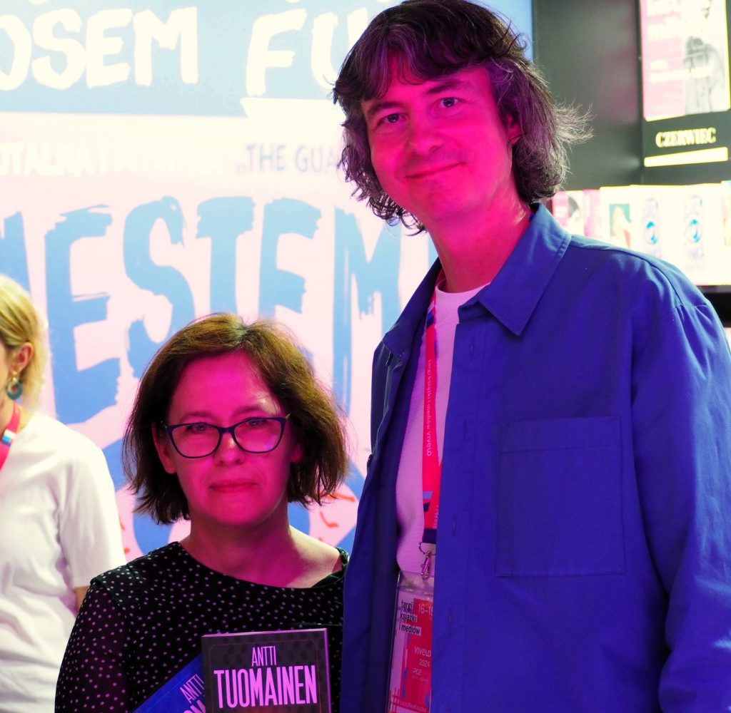 Oczywiście mam swoich ulubionych autorów. Od 10 lat ukochanym jest Antti Tuomainen, pisarz fiński (historią i kulturą Finlandii interesuję się od czasu studiów, ten kraj to moja duchowa ojczyzna). Jak mówi mój kolega – czytałam go, zanim to było modne, zanim jeszcze stał się w Polsce szerzej znany. W tym roku udało mi się spotkać z Anttim podczas targów książki w Warszawie i to było niesamowite przeżycie, spełnienie marzeń. Załączone zdjęcie jest właśnie z tego spotkania. Dzięki mnie grono fanów Anttiego się powiększa, kilka osób polubiło jego twórczość po moich poleceniach. Przyznaję, że to chyba jedyny przypadek, kiedy nie jestem obiektywna w ocenie książek – no ale przecież wiadomo, że miłość – także ta czytelnicza – jest ślepa.