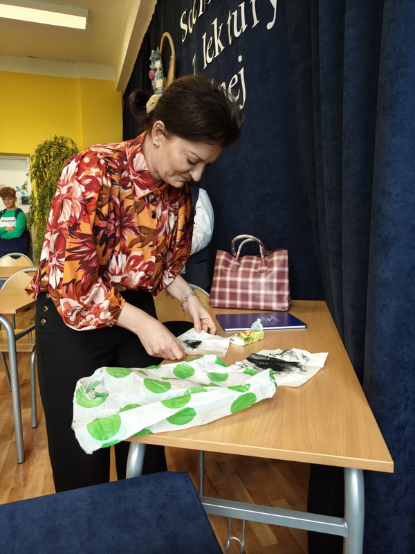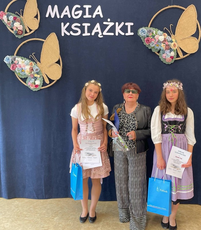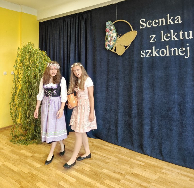 Zatrzymajmy się przy SCENKACH Z LEKTURY SZKOLNEJ. To je oglądałam, chłonęłam, oceniałam je wraz z dyrektorkami, paniami Bożeną Potyraj – PBP im. J. Lelewela i Eweliną Wielechowską – MCKiS (przewodnicząca komisji). Zgodne byłyśmy w swoich opiniach jurorskich. I tak przyznałyśmy dwa miejsca pierwsze i dwa drugie. Pierwsze przypadły: CZWÓRCE (kategoria klas VII-VIII) i TRÓJCE (kategoria klas IV-VI). Zespół PSP 4 im. Ireny Szewińskiej w składzie: Katarzyna Dziubińska i Klaudia Żuk zaprezentował scenkę z “Balladyny” Juliusza Słowackiego (“Gdyby siostra twoja żyła”). Wcieliły się w Balladynę i Goplanę. Świetne były – aktorsko i dykcyjnie. Ich świetnej grze towarzyszyły i przemyślane ruchy na scenie, i stroje. Zagrała w ich scence teatralnej również zminimalizowana scenografia – drzewo, wierzba. A dziewczęta? No, aktorzyce.