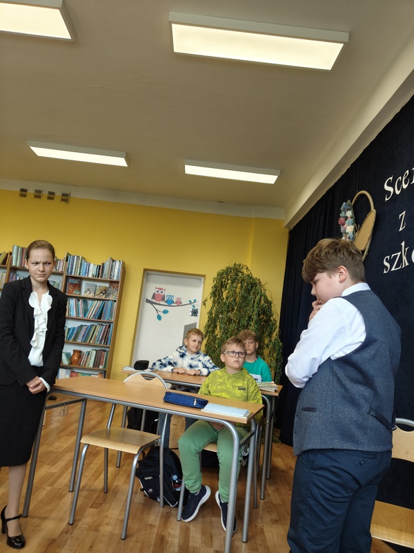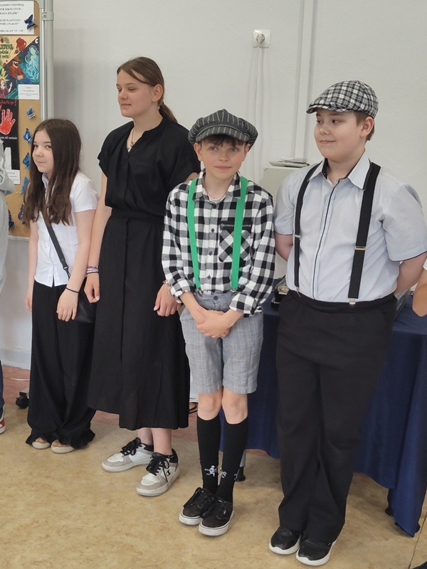 Zespoły PSP 1 im. Klaudyny Potockiej i PSP 2 zdecydowały się na scenki z MIKOŁAJKA (Rene Goscinny i Jean Jacques Sempe). To laureaci drugiej nagrody festiwalowej. JEDYNKA w składzie: Hanna Małkiewicz, Aleksander Niesiobędzki, Katarzyna Rachuba, Zuzanna Popowicz zaprezentowała scenkę pt. “Dwa oblicza Ludeczki”, DWÓJKA (Kacper Witkowski, Krzysztof Kwiatkowski, Helena Słomkowska, Adrian Kępczyński, Jan Brzeziński) “Wizytację”. Pierwsza scenka to spotkanie Mikołajka z Ludeczką, córką koleżanki mamy chłopca. Ich wspólna zabawa obfituje w sprzeczki i kończy się zbitą szybą przez Ludeczkę. Umiejętności piłkarskie dziewczynki wzbudzają w koledze respekt i stłuczkę bierze na siebie. Tyle treści, a gra sceniczna? Poprawna, chociaż mało emocjonalna, mało dynamiczna. Stroje przemyślane.`