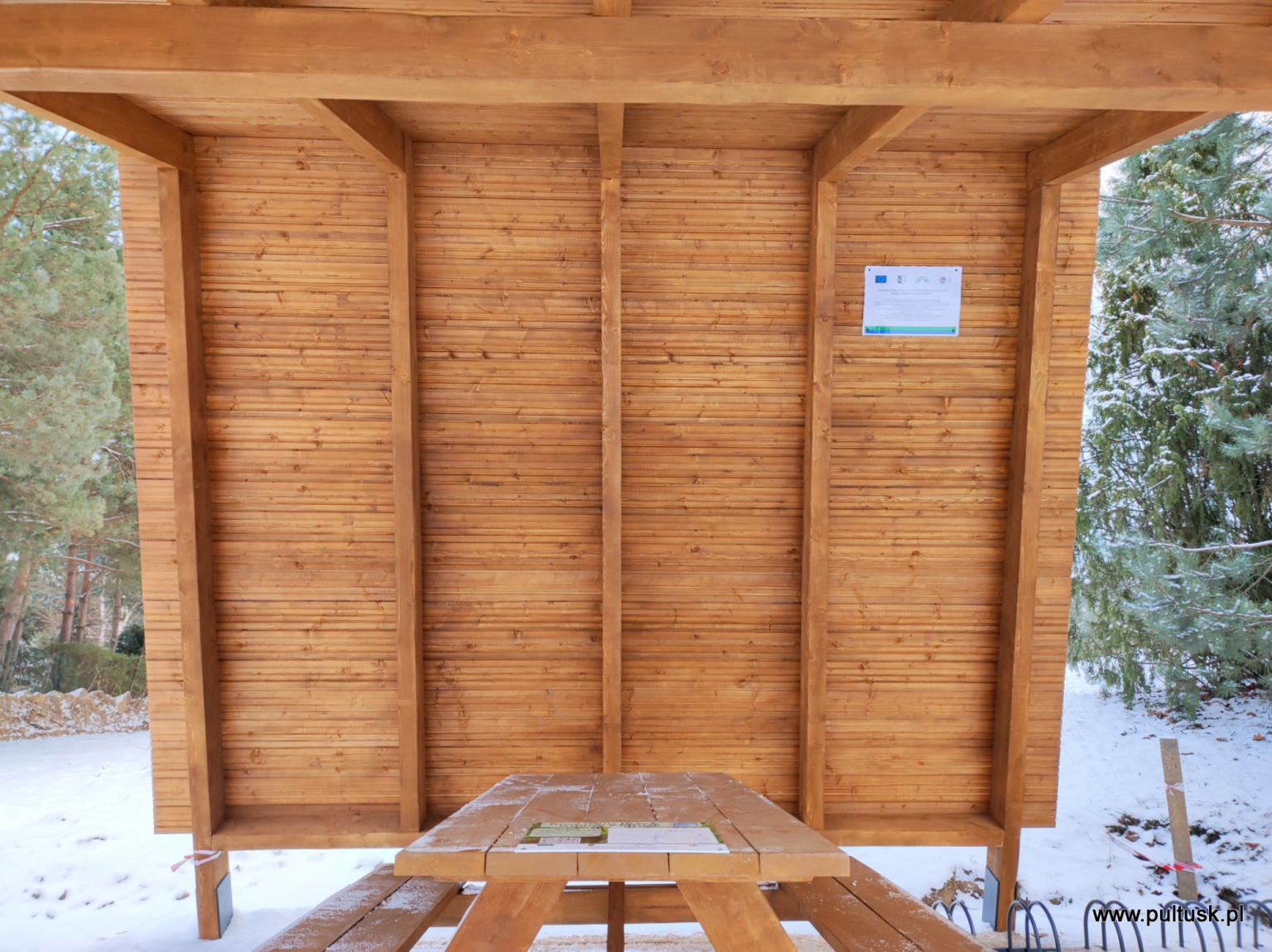 Urząd Miejski informuje o zakończeniu zadania związanego z modernizacją szlaków rowerowych na terenie gminy Pułtusk. Zadanie obejmowało: wykonanie i montaż 10 szt. drewnianych wiat przystankowych, wyposażonych w stoły oraz miejsca siedzące. Na stołach zostały zamontowane tablice, które zawierają zwięzłe informacje dotyczące danego szlaku rowerowego. Dwie ławki solarne z panelami fotowoltaicznymi wyposażone w porty USB. Kosze na śmieci i stojaki rowerowe przy każdej wiacie rowerowej.