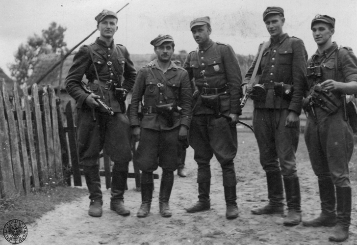 Kadra V Brygady Wileńskiej AK. Stoją od lewej: ppor. Henryk Wieliczko “Lufa”, por. Marian Pluciński “Mścisław” mjr Zygmunt Szendzielarz “Łupaszka”, plut. Jerzy Lejkowski “Szpagat”, ppor. Zdzisław Badocha “Żelazny”. (IPNLu 0205/8 – WUSW Lublin)