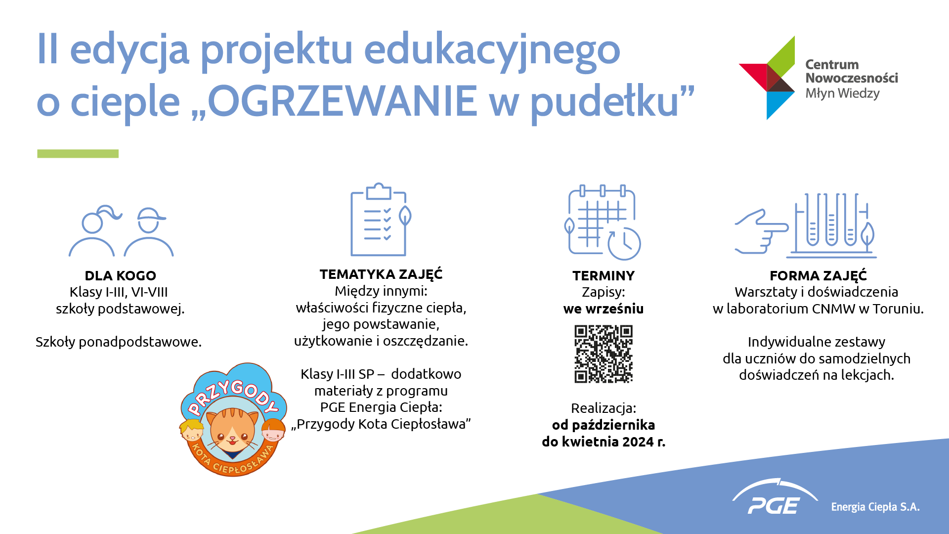 II edycja programu kierowana jest do uczniów starszych, tj. klas VI-VIII szkół podstawowych i szkół ponadpodstawowych i została rozszerzona – w stosunku do I edycji o młodsze dzieci czyli klasy I -III szkoły podstawowej. Poza doświadczeniami na temat ciepła, dostosowanymi do wieku młodszych klas, do tych uczniów kierowany jest również autorski program PGE Energia Ciepła „Przygody Kota Ciepłosława”. Wykorzystując animowaną postać Kota w prosty sposób prezentowane jest to jak powstaje ciepło, jak je użytkować i jak oszczędzać.