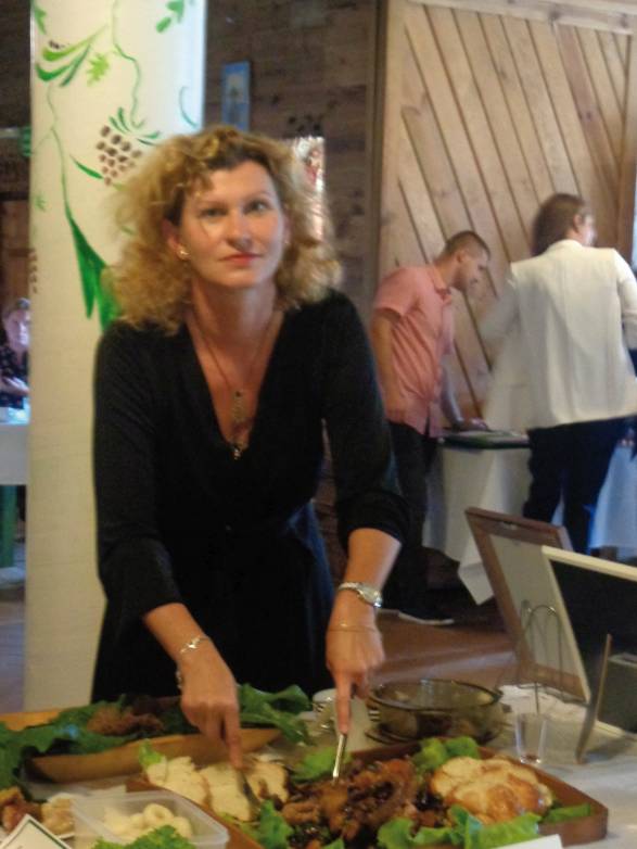 Adriana Machnacz, Młyn GĄSIOROWO: – Przywiozłam całe mnóstwo dobroci: danie główne to nasze szlagierowe policzki wołowe w sosie grzybowym z przecierakami oraz nalewkę z czeremchy. To owoc mało znany, to leśna karma dla ptaków w okresie jesiennym. Zbiera się je na przełomie września i października. Cykl produkcyjny trwa rok. Mój mąż Jacek Machnacz, szef naszej gospody w Gąsiorowie, jako osoba prywatna, przywiózł pasztet mazowiecki z królikiem, już utytułowany. Receptura? Z miejscowości Mordy pod Siedlcami, od babci Jacka, Anny Marczuk. A króliki z naszej hodowli. Do pasztetu ogórki kiszone i najlepszy na świecie chleb pszennożytni z piekarni pana Sławka Białczaka, pieczony specjalnie dla nas. Ostatnio wyszukane receptury? Zupa rosolnik, to taka jakby ogórkowa, ale inaczej. No i zarzutka chłopska, zupa z kapustą, pyszna rzecz.