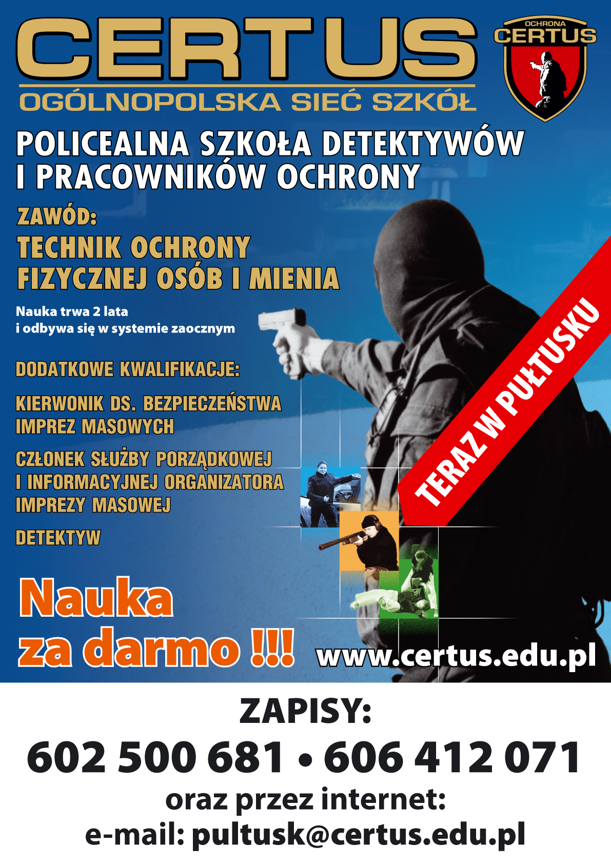 Certus to propozycja dla wszystkich, którzy bezpłatnie chcą zdobyć kwalifikacje do wykonywania popularnych i poszukiwanych obecnie na rynku pracy zawodów. Szkoła już działa w Pułtusku. W najbliższym numerze Tygodnika opublikujemy wywiad z jej dyrektorem Markiem Wierzbickim