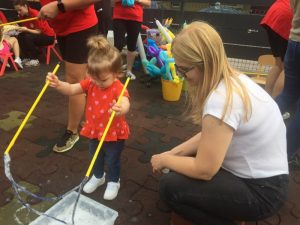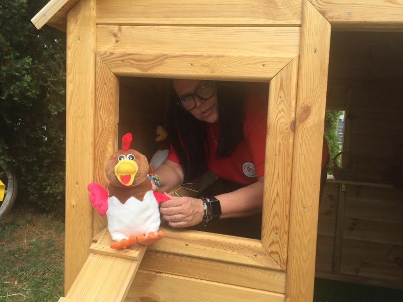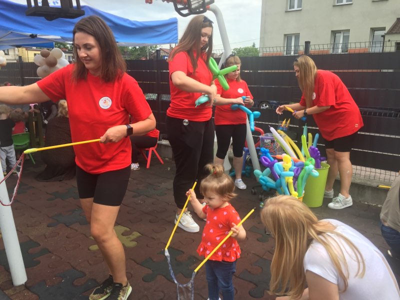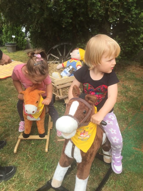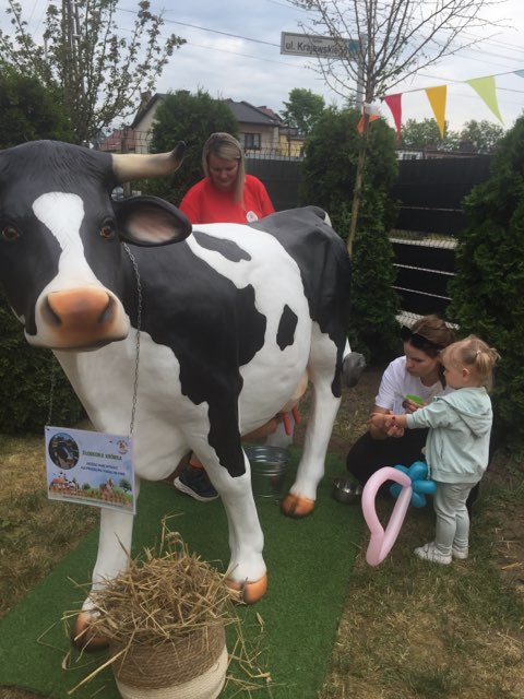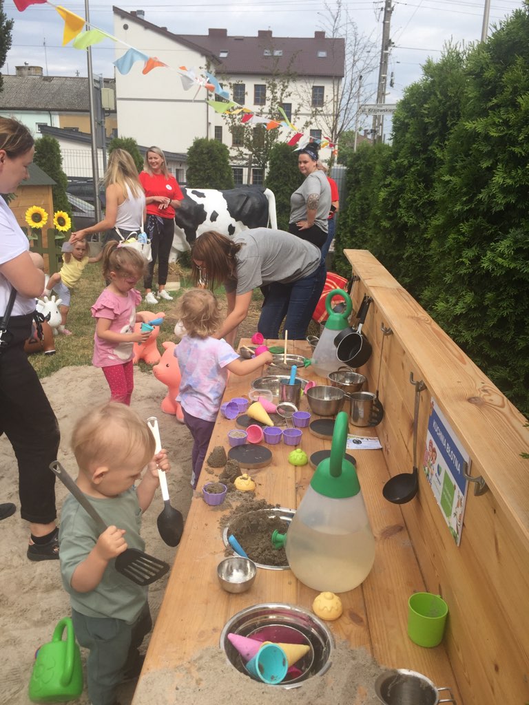 23 maja uczestniczyły w pikniku sensoryczno – edukacyjnym w ramach projektu DZIAŁAMY i WSPIERAMY; stąd ich liczna obecność w WIEJSKIEJ ZAGRODZIE, usytuowanej na terenie placówki. Ludzi było co niemiara: dzieci, ich rodzice, ciocie-wychowawczynie, pracownicy DE HEUS, strażacy… Duży ścisk był na dmuchańcach-skakańcach, ale też wszystkie pozycje zagrodowe były pełne.
