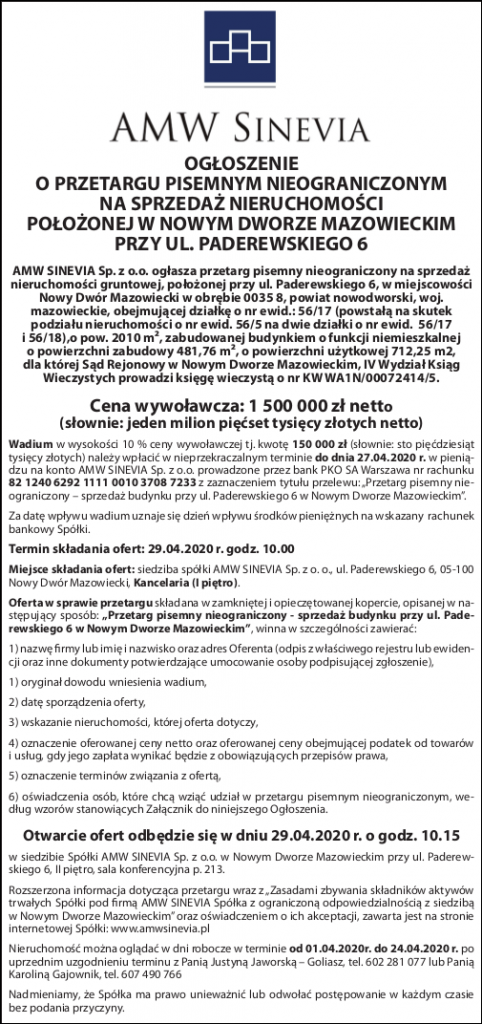 OGŁOSZENIE O PRZETARGU PISEMNYM NIEOGRANICZONYM NA SPRZEDAŻ NIERUCHOMOŚCI POŁOŻONEJ W NOWYM DWORZE MAZOWIECKIM PRZY UL. PADEREWSKIEGO 6 mzakaszewska 6 lat ago Podobne artykuły NOWY DWÓR MAZ. Wyrzuciła przez okno 50 tys. zł – u... KomentarzeSee more