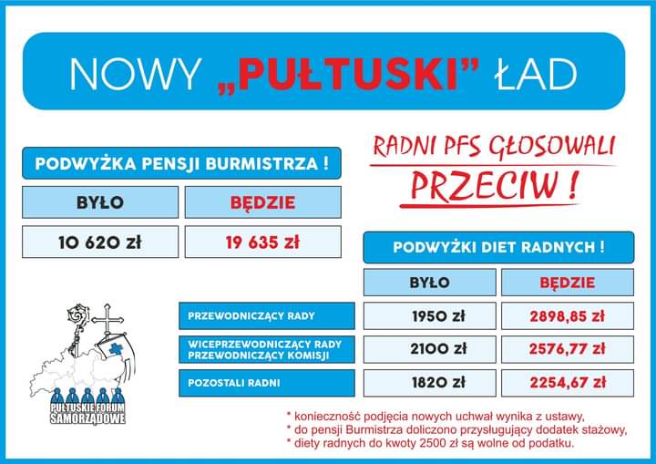 Dziś będzie ostro, bo inaczej być nie może. Pułtuskie społeczeństwo jeszcze nie otrząsnęło się z oburzenia po ostatnich horrendalnych podwyżkach pensji starosty i diet radnych powiatowych, a tu już gminni przygotowali sobie miłą, a nam mieszkańcom przykrą i bardzo rozczarowującą niespodziankę. I choć na forach internetowych, gdzie też zaglądają, czytają, czasem komentują nasi włodarze, aż wrzało z oburzenia po podwyżkach w powiecie, oni postanowili się tym zupełnie nie przejmować. Rządzący gminą przyjęli argumentację przewodniczącego Rady Powiatu Tadeusza Nalewajka, że przy okazji podwyżek zawsze były kontrowersje, a jak jest okazja to trzeba sobie i innym kolegom z samorządu dorzucić. Wszakże do następnych wyborów jeszcze kawałek czasu, ludzie pogadają, ponarzekają i zapomną, a potem znowu będzie się im wciskać kit, jak to kandydatowi X lub Y zależy na zdaniu mieszkańców, jak szanują ich potrzeby, jak chcą im z misją służyć. Mówiąc obrazowo, flaki się od tego przewracają, tym bardziej, że jak to napisał znany pułtuski felietonista Wojciech A. Dąbrowski, w czasie ostatnich akcji charytatywnych w naszym mieście jakoś cicho o tym, że jakaś Rada gminna lub powiatowa się skrzyknęła i swoje diety, choćby jednomiesięczne, przekazała na pomoc potrzebującym. Nic to, ustawodawca dał możliwość, trzeba więc z niej skorzystać prawie maksymalnie, nie do końca, żeby nie przesadzić, ale minimalna podwyżka byłaby przecież krzywdząca dla tak ciężko pracujących…