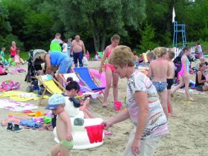 A tłok? Kiedy upał, na plażę ciągną rodzice z dziećmi, babcie z wnukami, koloniści, młodzież… Każdy z nich znajdzie dla siebie swoją przestrzeń w wodzie, swoją GŁĘBIĘ. Są więc wygrodzone baseniki dla maluszków, dla dzieci starszych, jest pomost…