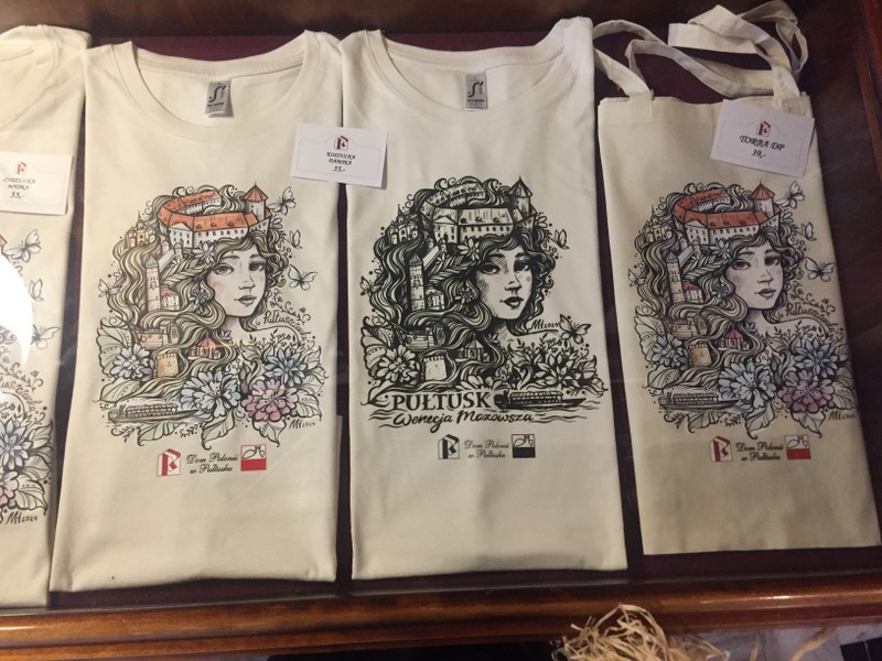 W Domu Polonii, w recepcyjnej sali, przypatrzyliśmy się bardzo ciekawym gadżetom związanym z Pułtuskiem. To biała bluzeczka z krótkimi rękawami z nadrukiem związanym z naszym miastem. Oto dziewczyna o bujnych włosach, w nich, jak koronę, ma …zamek. Do koszulki mamy pasującą lnianą torbę z takim samym nadrukiem. Bardzo to pomysłowe i bardzo estetyczne. Rzeczywiście, dobrze służące promocji miasteczka. Dzieło Domu Polonii.