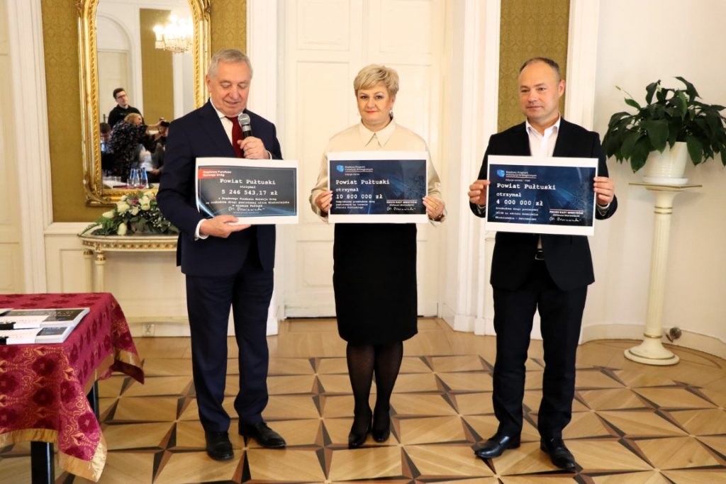 W środę, 11 października, starosta pułtuski Jan Zalewski wraz z wicestarostą Beatą Jóźwiak, odebrali z rąk ministra, członka Rady Ministrów Henryka Kowalczyka symboliczne promesy na dofinansowanie rozbudowy i przebudowy dróg powiatowych. Łączna kwota dofinansowania wynosi ponad 20 milionów złotych i pochodzi z trzech źródeł: