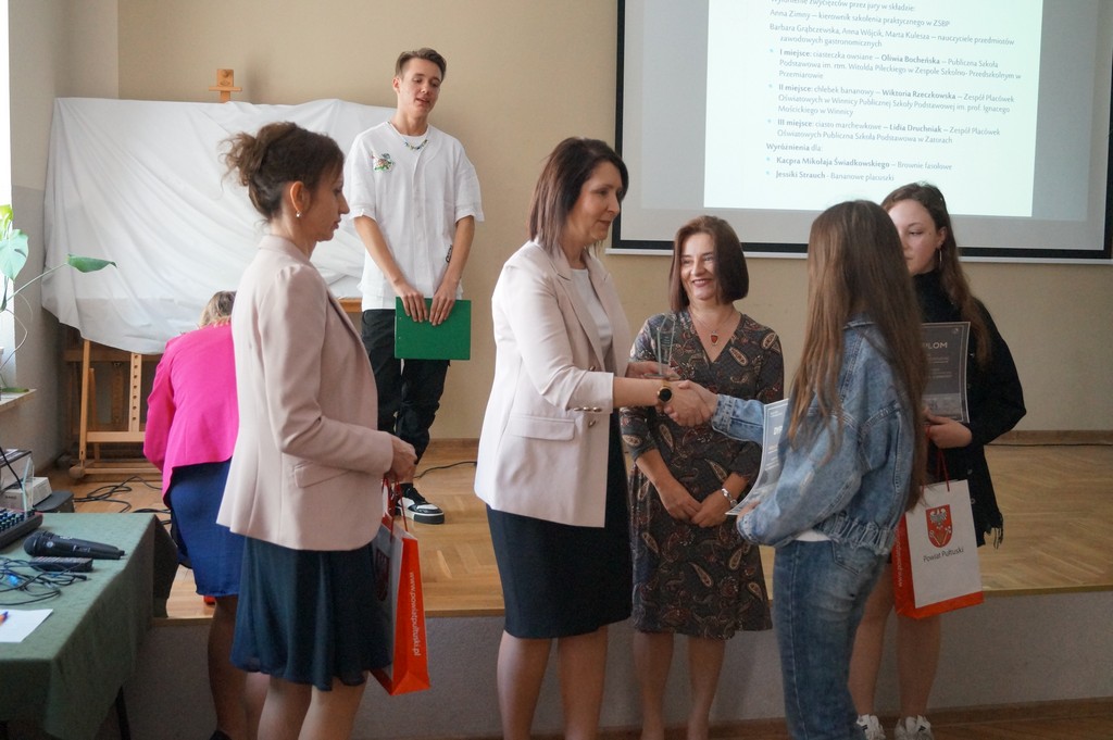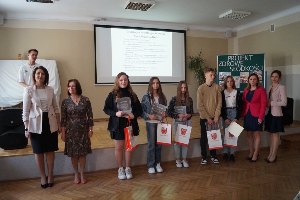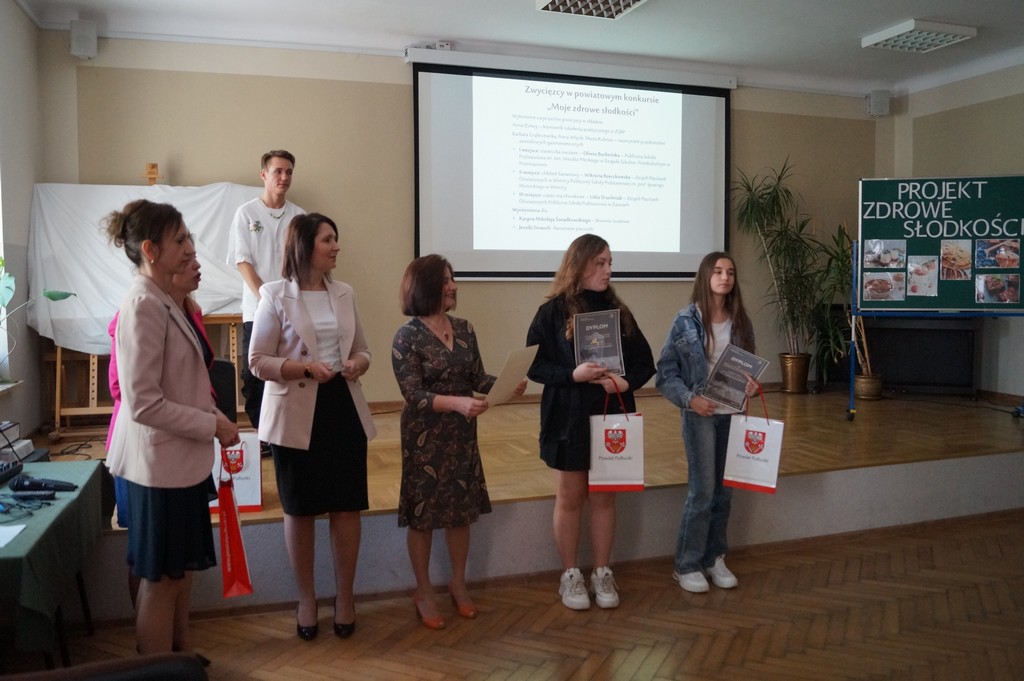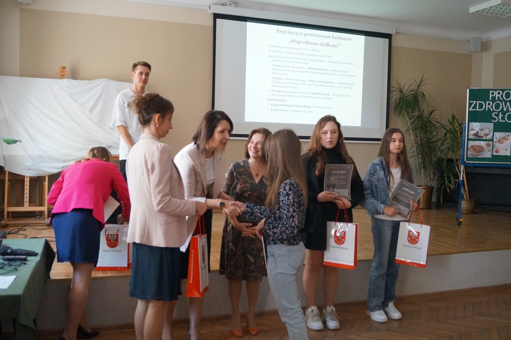 20 maja, w Zespole Szkół im. B. Prusa w Pułtusku odbyło się podsumowanie projektu edukacyjnego „Zdrowe słodkości”, który realizowany był od października 2021 do kwietnia 2022. Dyrektor szkoły przywitała gości spotkania: Katarzynę Jankowską Dyrektor Wydziału EZK Starostwa Powiatowego w Pułtusku, nagrodzonych w konkursie uczniów klas ósmych z powiatu pułtuskiego i ich opiekunów oraz nauczycieli i uczniów Zespołu Szkół im. B. Prusa w Pułtusku biorących udział w projekcie. Podczas spotkania uczestnicy obejrzeli – w formie prezentacji – efekty pracy i podjęte działania projektowe. Następnie wręczono nagrody zwycięzcom powiatowego konkursu „Moje zdrowe słodkości” – statuetki i książki ufundowane przez Powiat Pułtuski. Na koniec spotkania zaproszeni goście, nauczyciele i młodzież miała okazję skosztować zdrowych słodkości, przygotowanych przez uczniów klas drugich i trzecich o profilu gastronomicznym i technik żywienia.