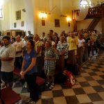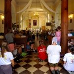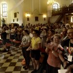 Idzie Pielgrzymka Ełcka. Jak co roku, w południe pielgrzymi docierają do kościoła św Krzyża w Pułtusku. Chłód posadzki łagodzi ból nóg.