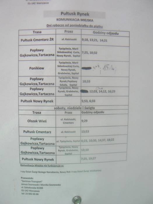 No cóż, nie powinno to być dużym zaskoczeniem, że autobusy miejskie kursujące w Pułtusku i okolicach nie będą przepełnione jak to bywa w dużych miastach. Mieszkańcy wsi również nie codziennie jeżdżą na zakupy czy do lekarza. Komunikacja miejska to nie interes, na którym gmina może zarobić, raczej trzeba się liczyć z ciągłym dopłacaniem. Radny Andrzej Wydra ma jednak świętą rację! Nie można likwidować kursów z pozycji urzędniczego stołka i robić akcji z wykreślaniem i dopisywaniem czegoś pisakiem na tabliczkach przystankowych, tak jak to uczyniono, np. w Rynku (patrz zdjęcie obok). Jak to skomentowała mieszkanka czekająca na “wykreślony” w ten sposób autobus? Cytujemy: