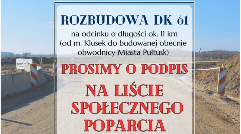 Zarząd Dróg Powiatowych w Pułtusku zwraca się z uprzejmą prośbą o pomoc w zebraniu społecznego poparcia dla rozbudowy DK 61 na odcinku o długości ok. 11 km (od m. Klusek do budowanej obecnie obwodnicy Miasta Pułtusk) zgodnie ze stanowiskiem Rady Powiatu w Pułtusku z dnia 26.09.2024r.