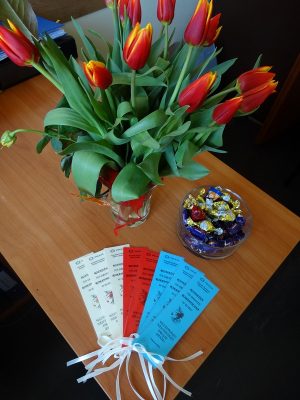 Policjanci z Wydziału Ruchu Drogowego Komendy Powiatowej Policji w Pułtusku, z okazji Dnia Kobiet, podczas kontroli drogowych wręczali paniom za kierownicą własnoręcznie wykonane zakładki do książki. Akcji przyświecało motto – ,,Rozważna na drodze, romantyczna w domu”.